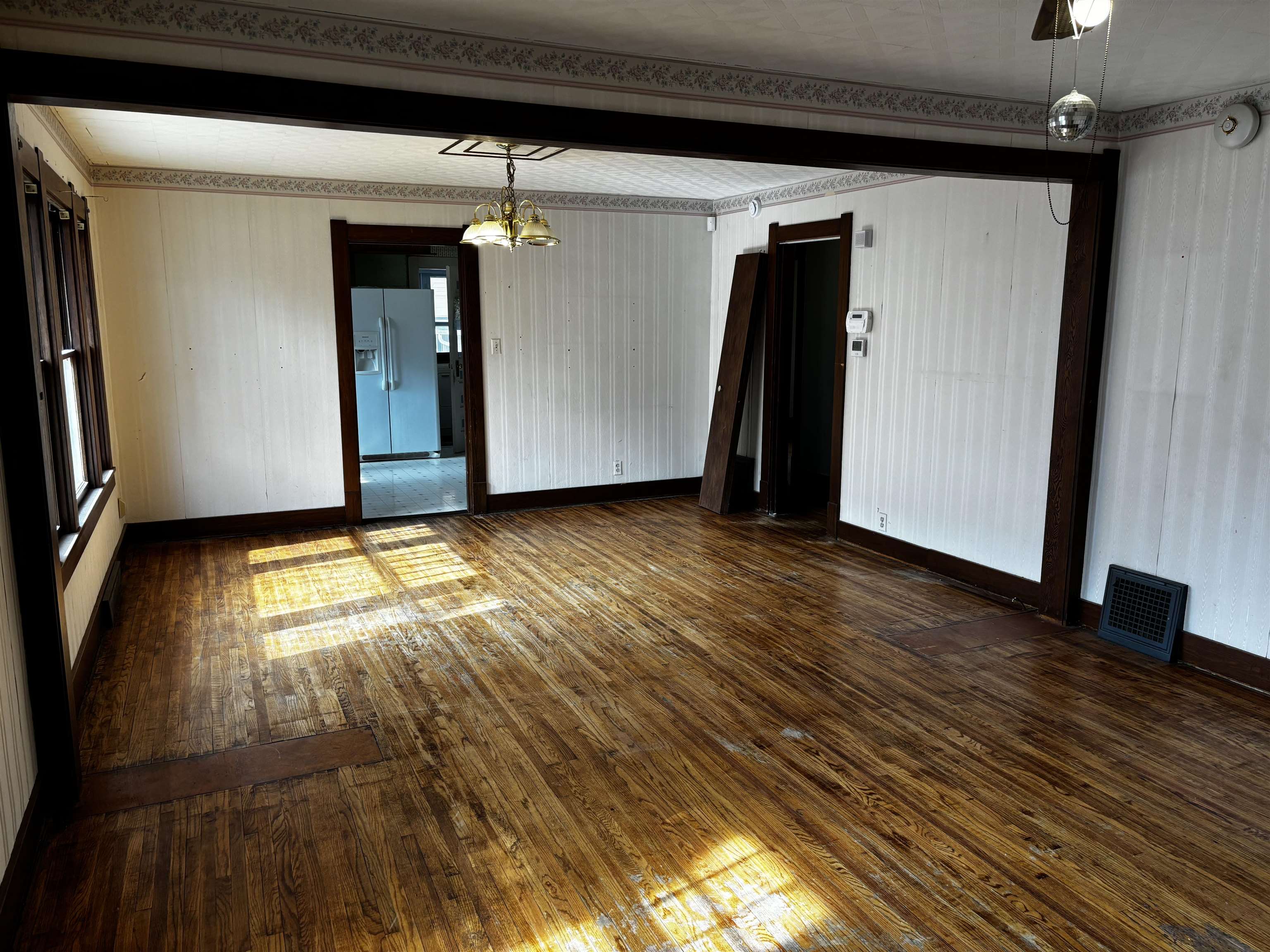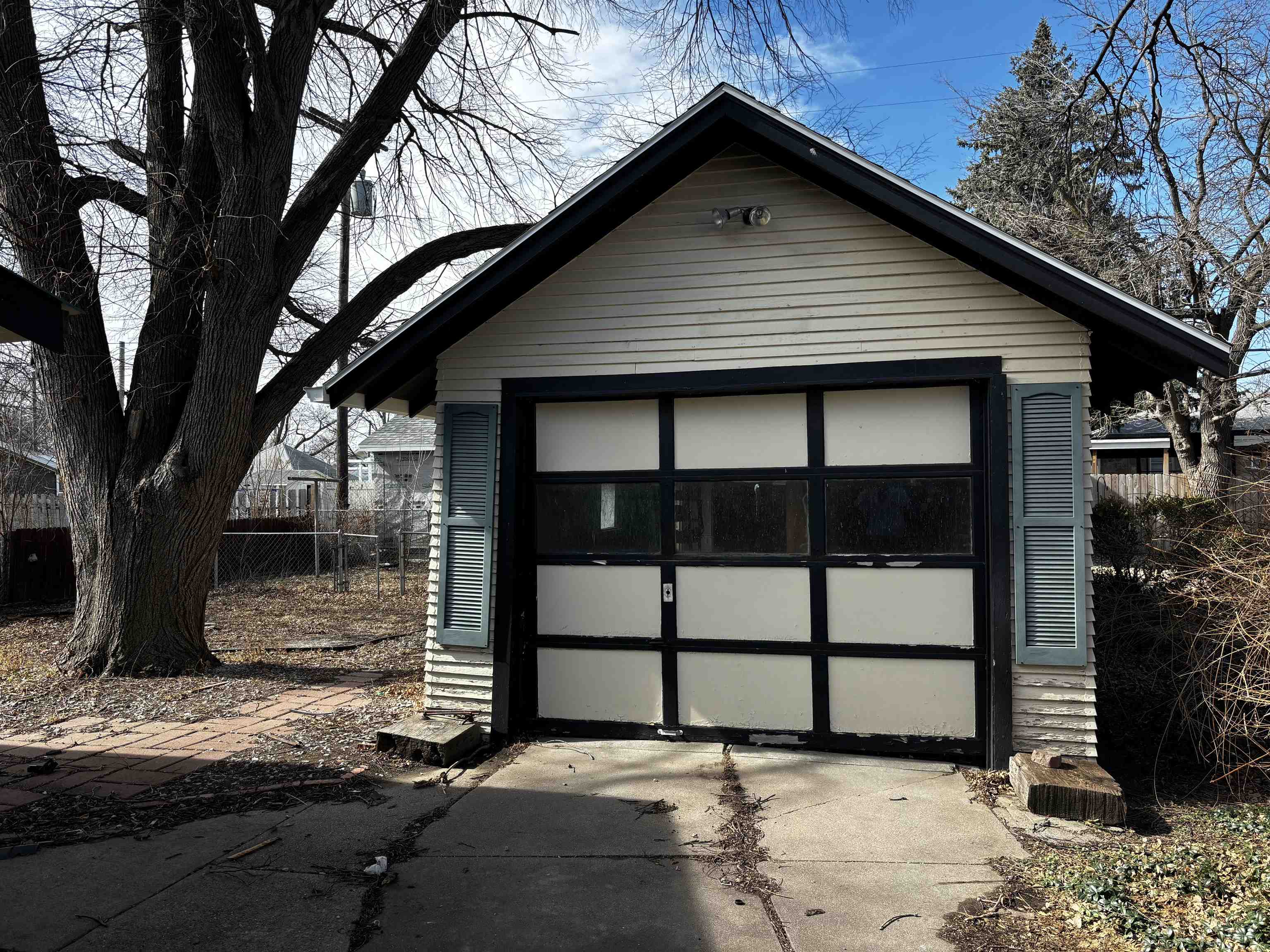 Bungalow style home with 2 main floor bedrooms, large living room/dining room with wood floors, eat-in kitchen including all appliances and ample cabinet space including a pull-out pantry cabinet, main floor laundry, enclosed front and back porch, covered back patio and an oversized single garage with workshop.